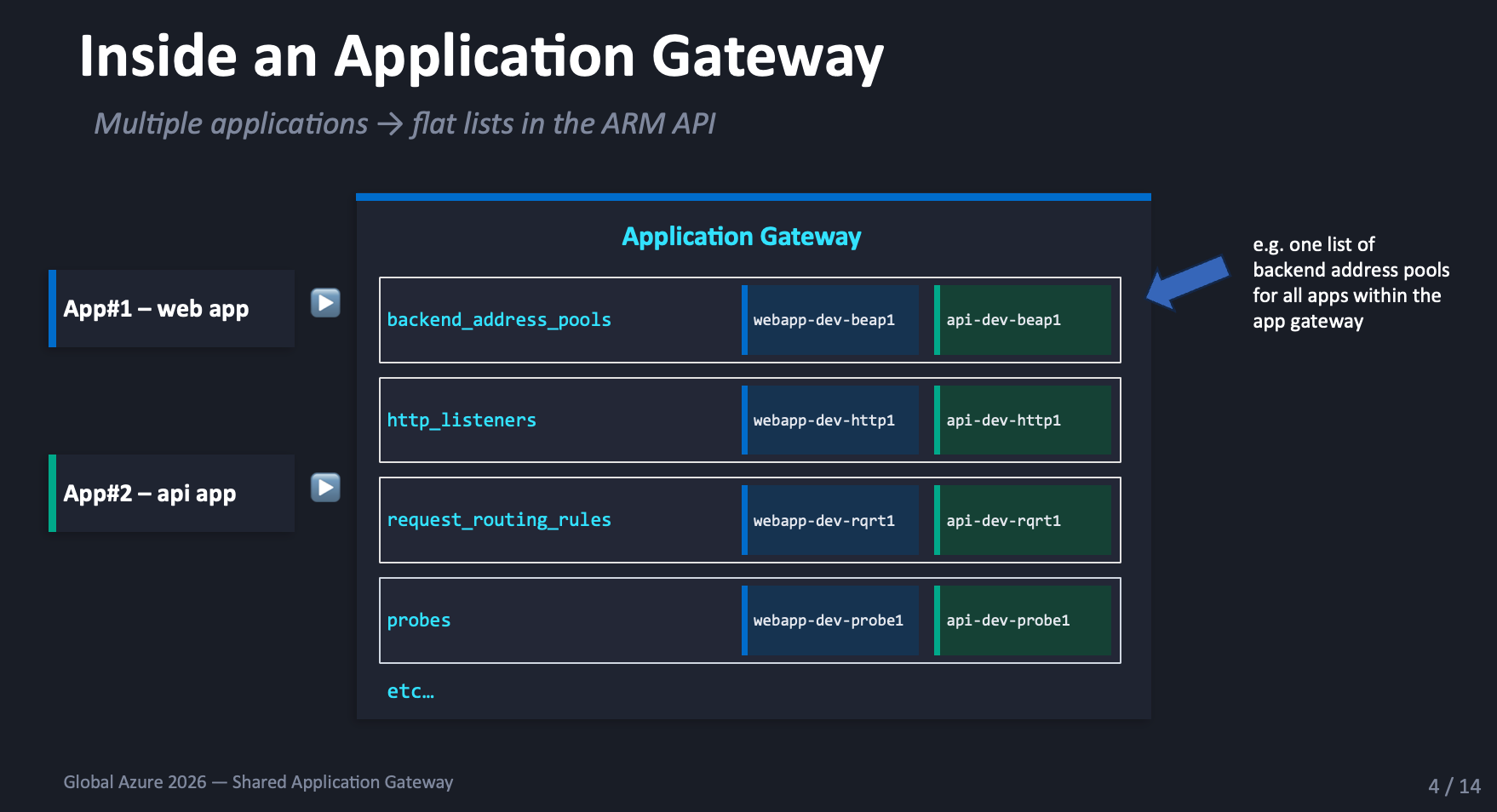 Global Azure 2026 talk: AzAPI list handling and per-app configs for shared Application Gateways.